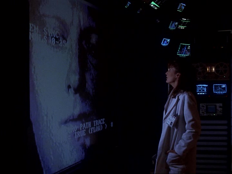 Depuis 2001, l’odyssée de l’espace, le cinéma cultive une défiance envers la chose informatique qui trouve un prolongement à l’entame des années 80 avec des films aussi différents que Wargames (la guerre nucléaire à portée de clic d’un adolescent), Terminator (la prise de pouvoir des machines) ou encore Electric Dreams (l’ordinateur de compagnie qui cherche à éliminer l’homme de la maison). Mémoire éternelle reprend ce qui était encore un argument de science-fiction mais l’aborde sous un jour plus romantique. L’épisode se montre peu disert sur les motivations et surtout sur l’identité des commanditaires des recherches entreprises par le couple Baldwin et leur équipe. L’essentiel tient à cette volonté de perdurer au-delà de la mort dans un mouvement egotique masqué derrière l’excuse de l’amour éternel. John Baldwin se meurt et avec lui c’est tout le savoir en sa possession qui risque de disparaître. Néanmoins, il n’envisage pas la transmission car en réalité, l’autre point qui le chagrine par dessus tout réside dans son incapacité à vivre suffisamment longtemps pour voir la fin des travaux entrepris. Il ne peut se résoudre à ne pas pouvoir porter ses recherches jusqu’à leur terme. Se joue en creux son strapontin pour la postérité qu’il ne veut laisser à personne d’autre. Pas même à son épouse. Il n’a rien du savant fou. Tout ce qu’il fait est savamment réfléchi et répond à un plan bien établi. Au passage, il ne rechigne pas au chantage émotionnel lorsqu’il s’agit de rallier Catherine à sa décision. Le personnage s’avère plus retors que l’image liminaire du savant amoureux et souffreteux. Sa soif de reconnaissance le pousse à une certaine cruauté. Une cruauté qu’il ne vit pas comme telle – il est persuadé d’agir pour le mieux – mais pourtant bien réelle. Et c’est Catherine qui en fait les frais. Catherine qui doit supporter que leurs souvenirs intimes soient jetés en pâture à tous les autres membres de l’équipe. C’est elle encore qui doit porter la charge mentale des errances de son mari après avoir déjà été un soutien de tous les instants. Sous son vernis romantique, Mémoire éternelle cache une noirceur aussi inattendue qu’involontaire. Involontaire car le final cultive une forme d’émerveillement face à la manifestation d’un amour éternel, ultime soubresaut de vie chez l’homme devenu machine.